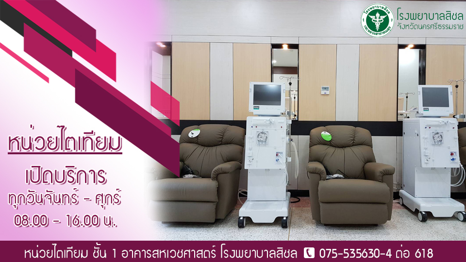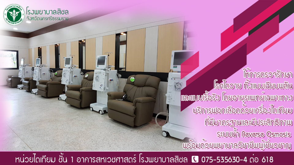 กลุ่มงานไตเทียม ฟอกเลือดด้วยเครื่องไตเทียม ผู้ป่วยที่มีภาวะไตวายเรื้อรังและเฉียบพลัน ทางศูนย์ไตเทียมโรงพยาบาลสิชล มีเครื่องไตเทียมจำนวน 10 เครื่อง และมีทีมงานที่เชี่ยวชาญ และมีประสบการณ์ไว้คอยบริการ ดูแลผู้ป่วย พร้อมทั้งพยาบาล ซึ่งผ่านการอบรมและรับรองจาก สมาคมโรคไตแห่งประเทศไทย