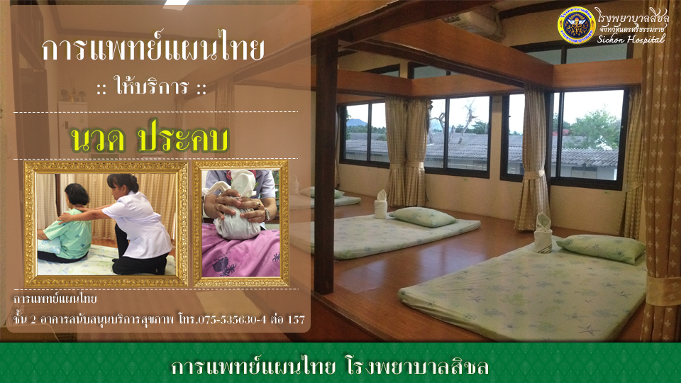 แพทย์แผนไทยให้บริการตรวจ วินิจฉัย รักษา ฟื้นฟูสภาพ ส่งเสริมและป้องกันโรคด้วยศาสตร์การแพทย์แผนไทย และมีผู้ป่วยชแพทย์แผนไทย (ด้านการนวด) ที่ผ่านการอบรม 330 ชั่วโมง